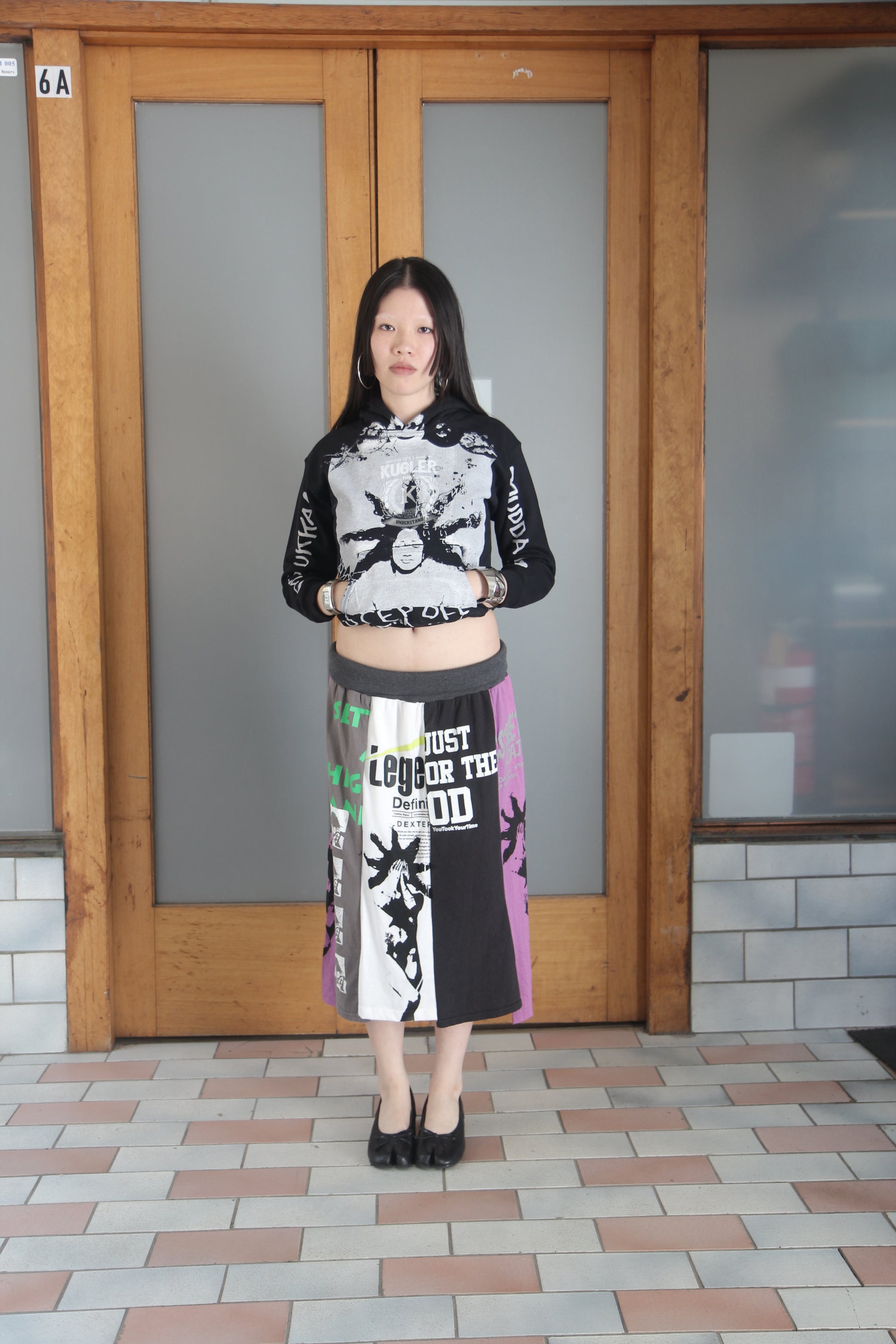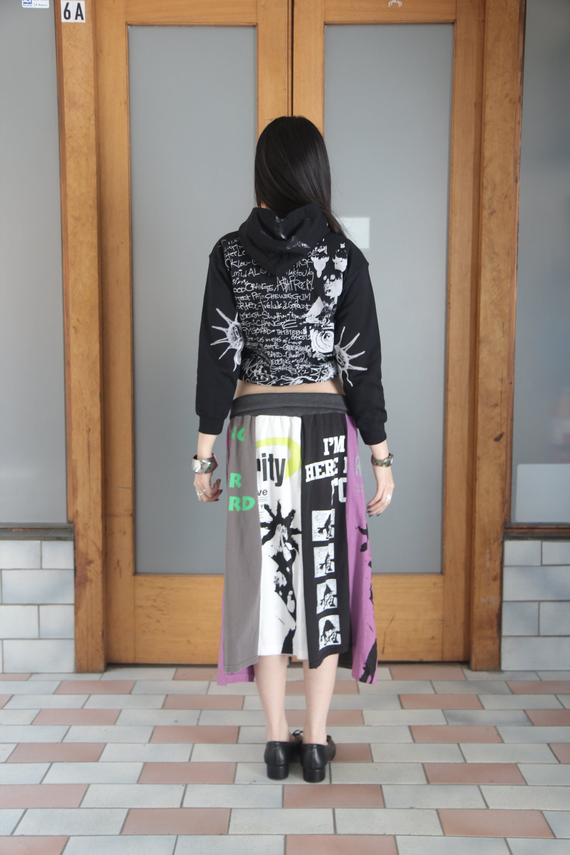 Panneled skirt with waist band, screen-printed on up-cycled cotton.