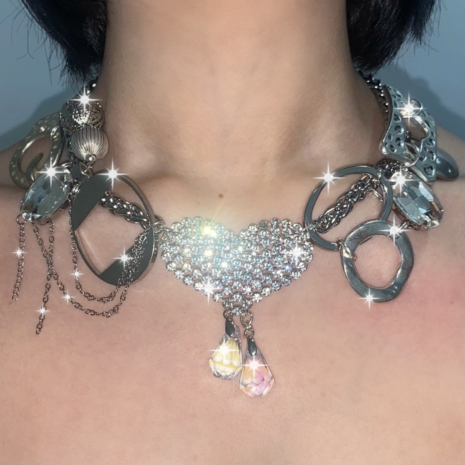 Handmade necklace with steel chains, glass beads and vintage brooch