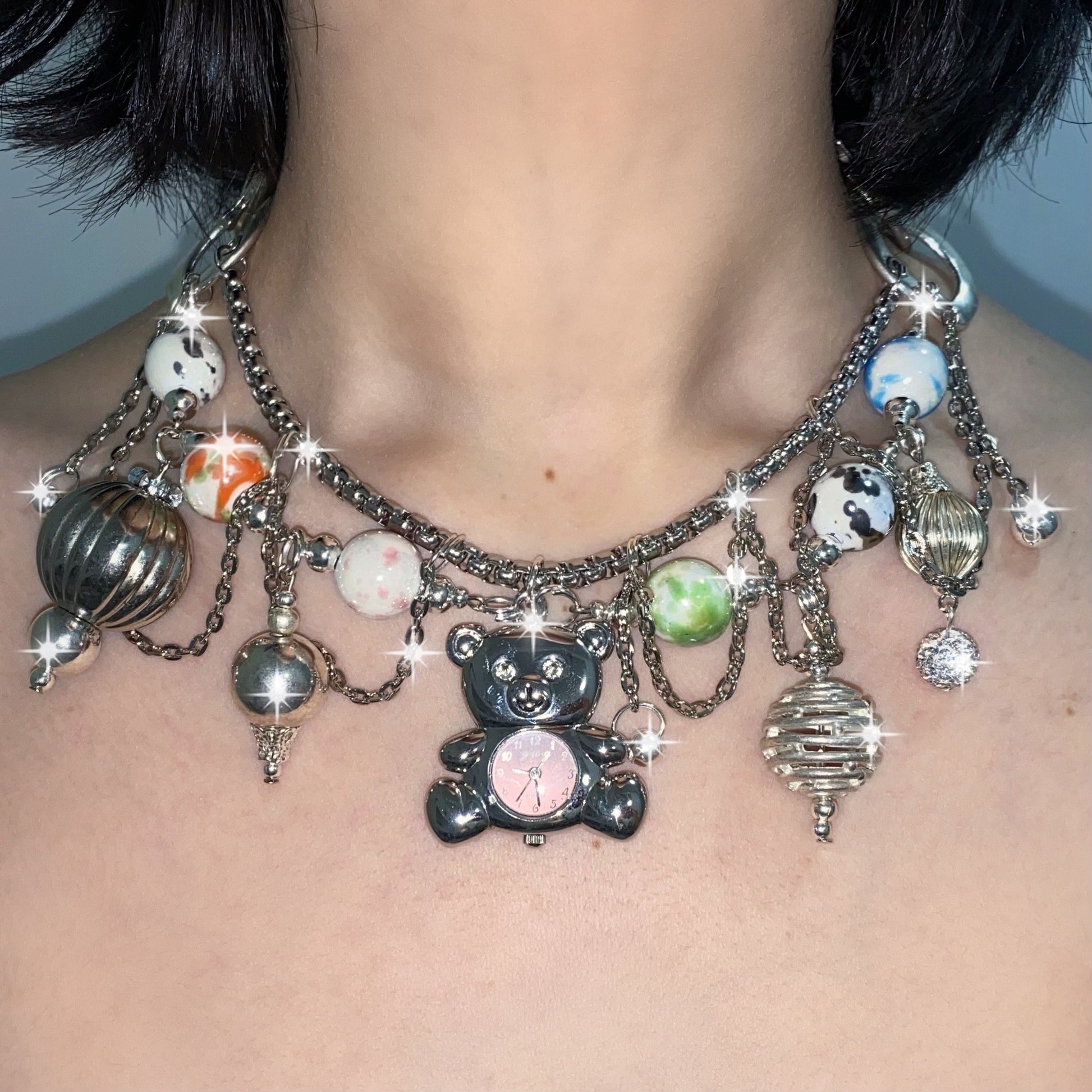 Handmade necklace with steel chains, plastic, glass and vintage charms