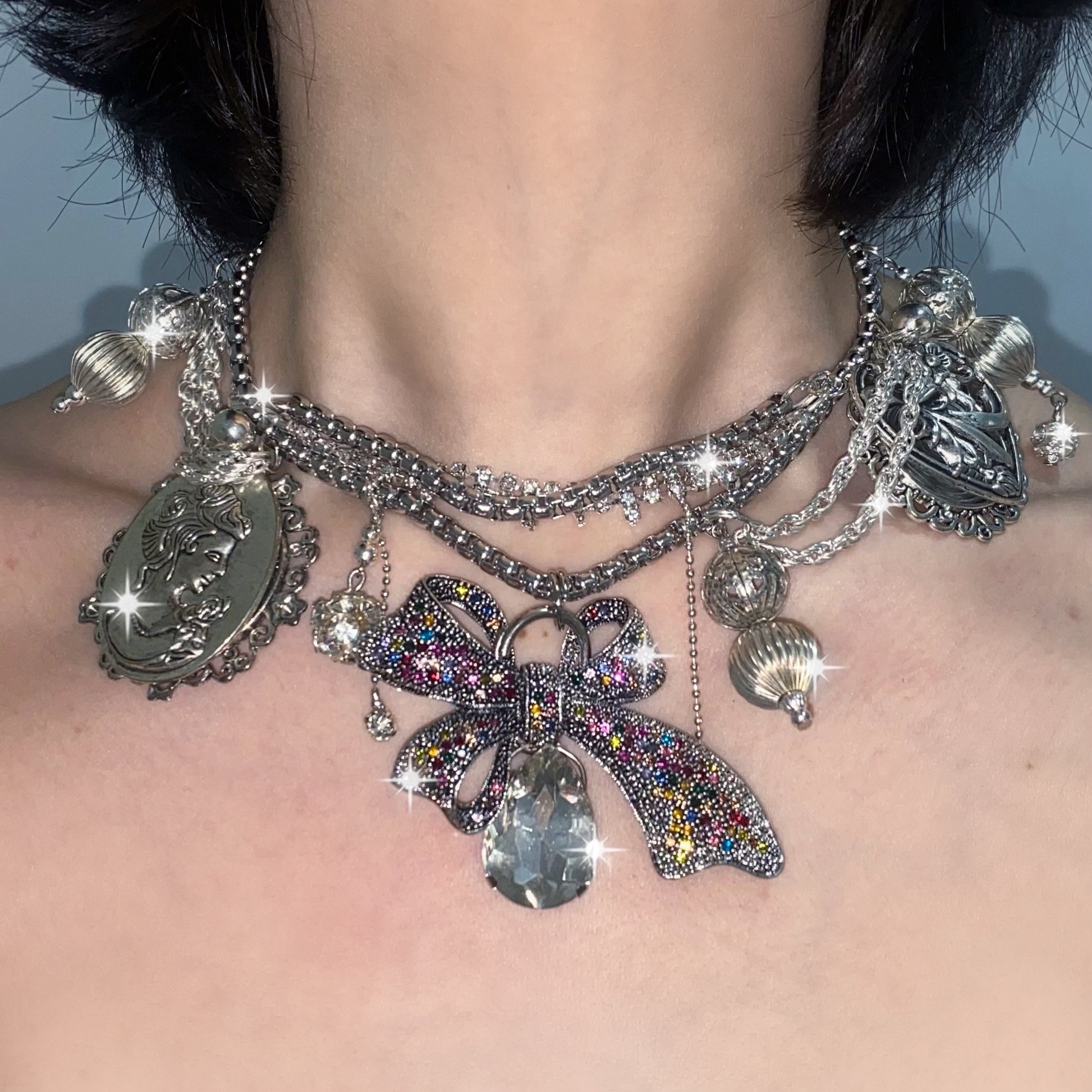 Handmade necklace with steel chains, rhinestones, charms and vintage brooch