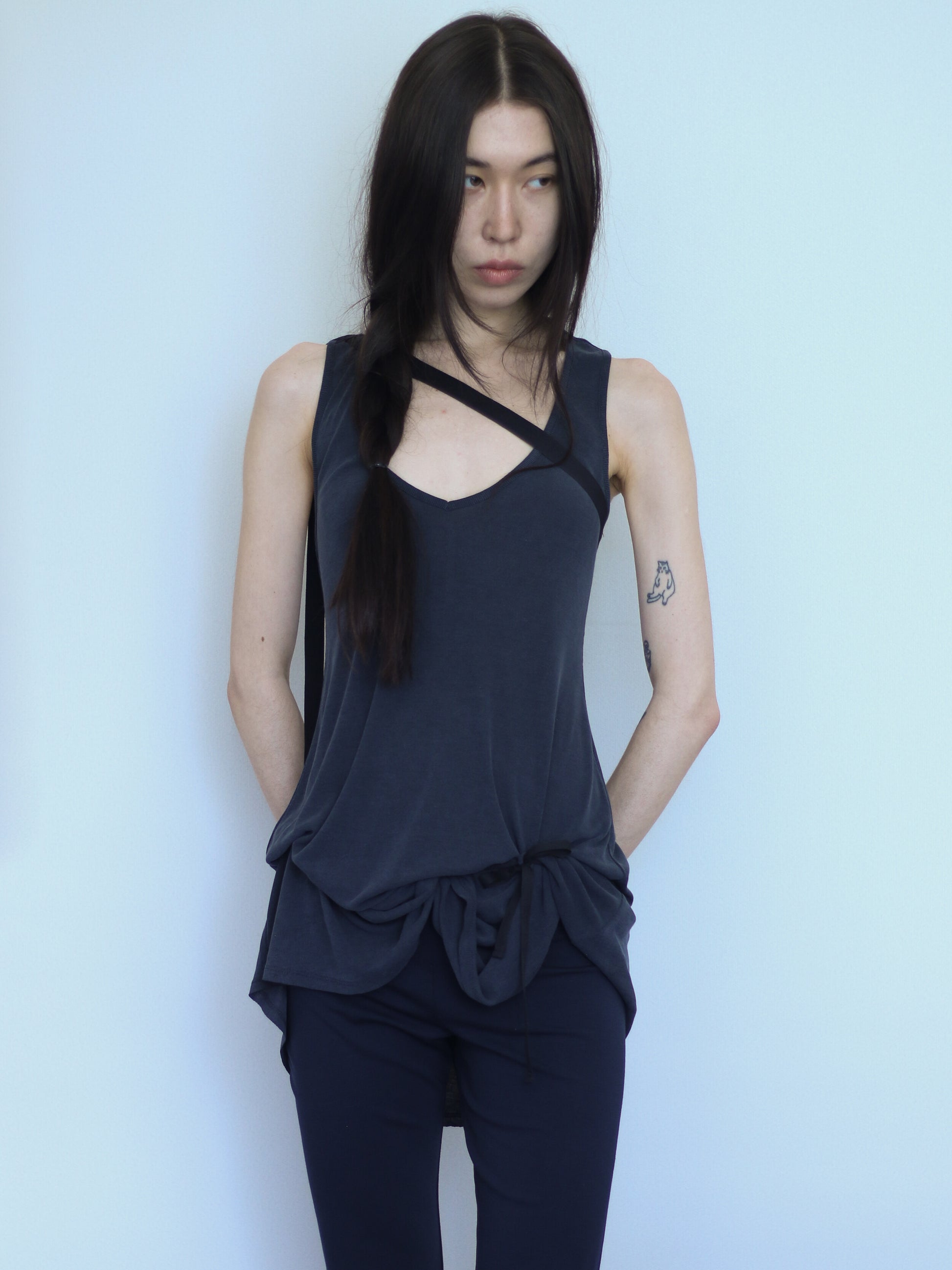 A basic-line piece developed from cotton rib fabric, part of the chiyagi humble D line. Designed with a soft, body-skimming silhouette that can be styled as either a long top or a dress. The fabric drapes fluidly with a gentle flare, creating movement and ease.