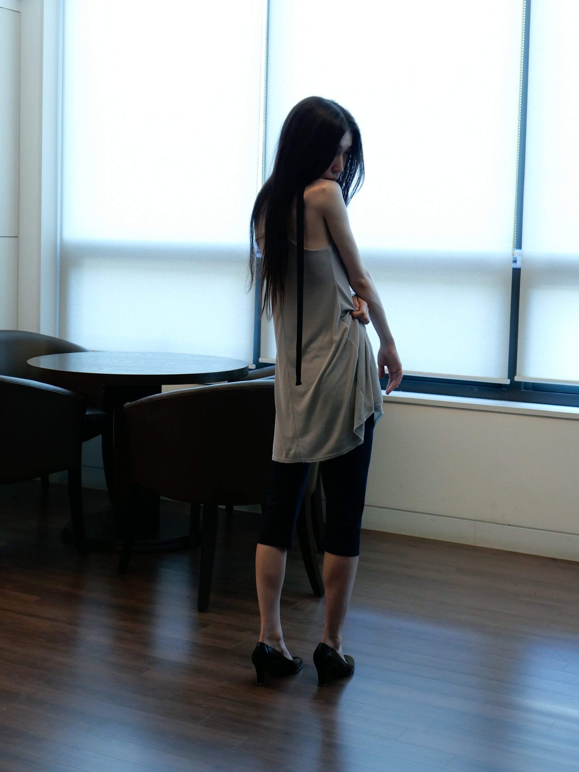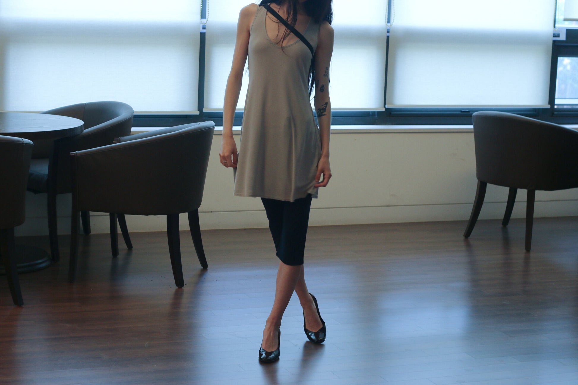 A basic-line piece developed from cotton rib fabric, part of the chiyagi humble D line. Designed with a soft, body-skimming silhouette that can be styled as either a long top or a dress. The fabric drapes fluidly with a gentle flare, creating movement and ease.
