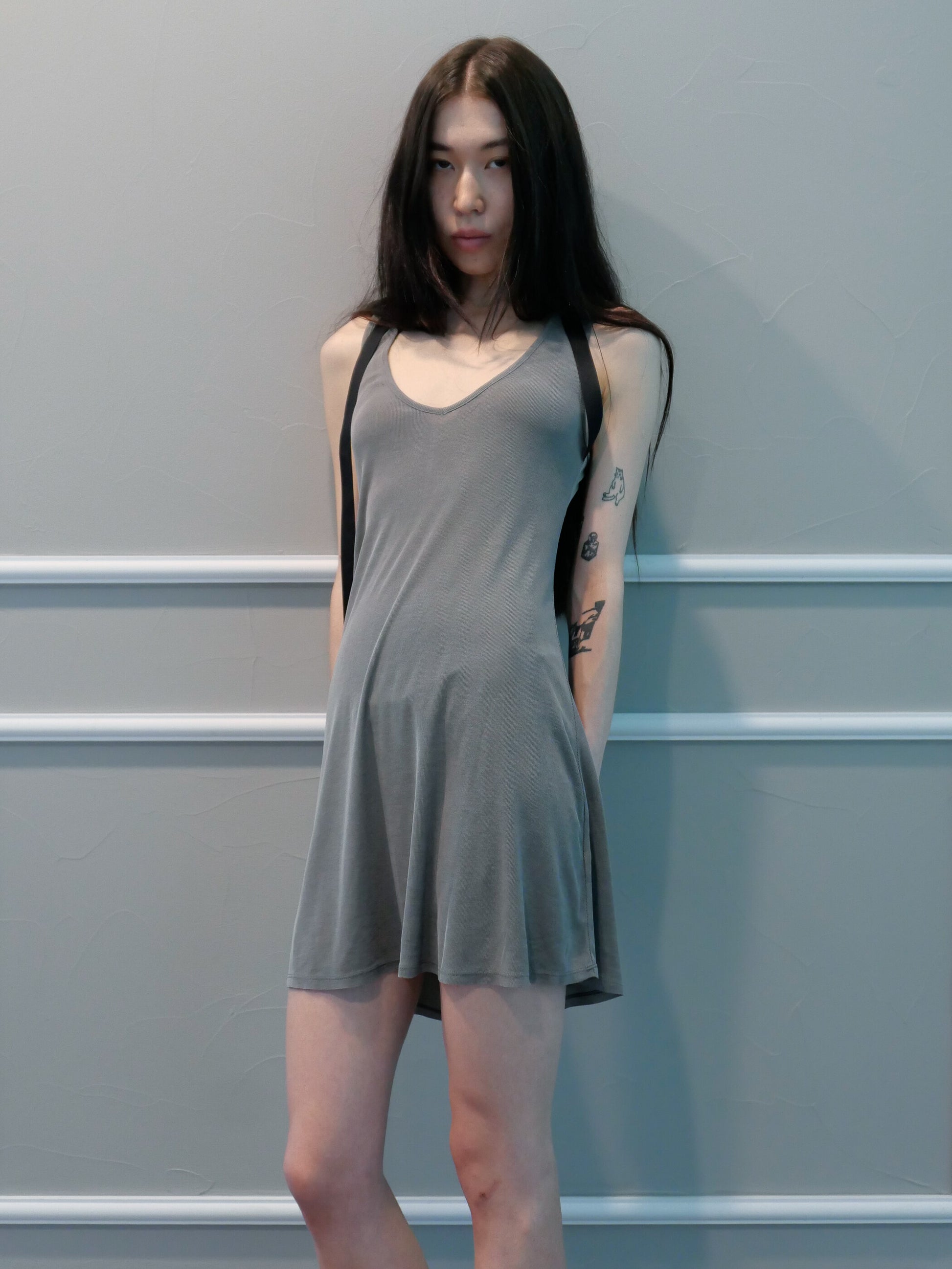 A basic-line piece developed from cotton rib fabric, part of the chiyagi humble D line. Designed with a soft, body-skimming silhouette that can be styled as either a long top or a dress. The fabric drapes fluidly with a gentle flare, creating movement and ease.