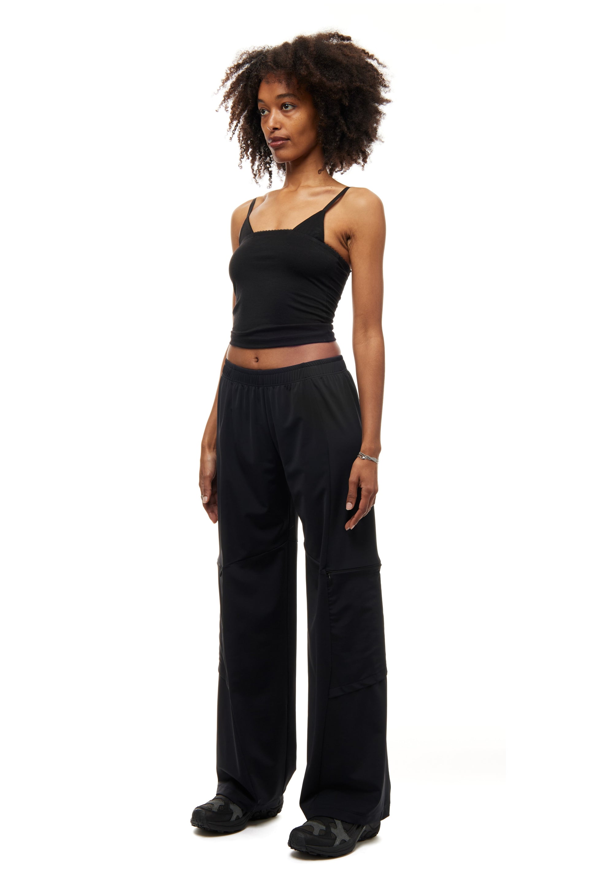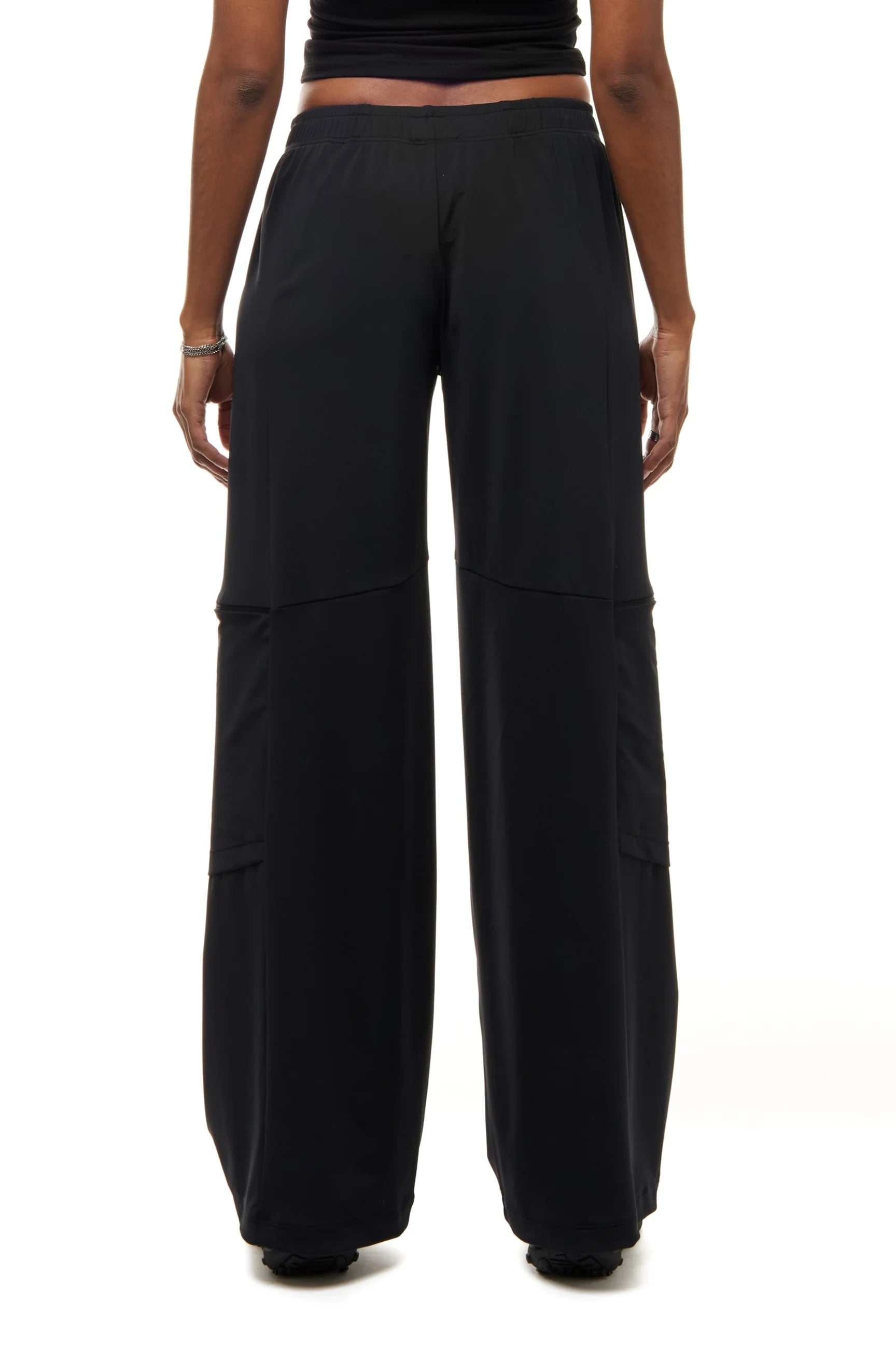 TWIST ON THE CLASSIC - CARGO PANT IN BLACK LYCRA WITH ZIPPED POCKETS AND PANEL DETAILING. ELASTICATED WAIST, SHAPED STRAIGHT LEG.